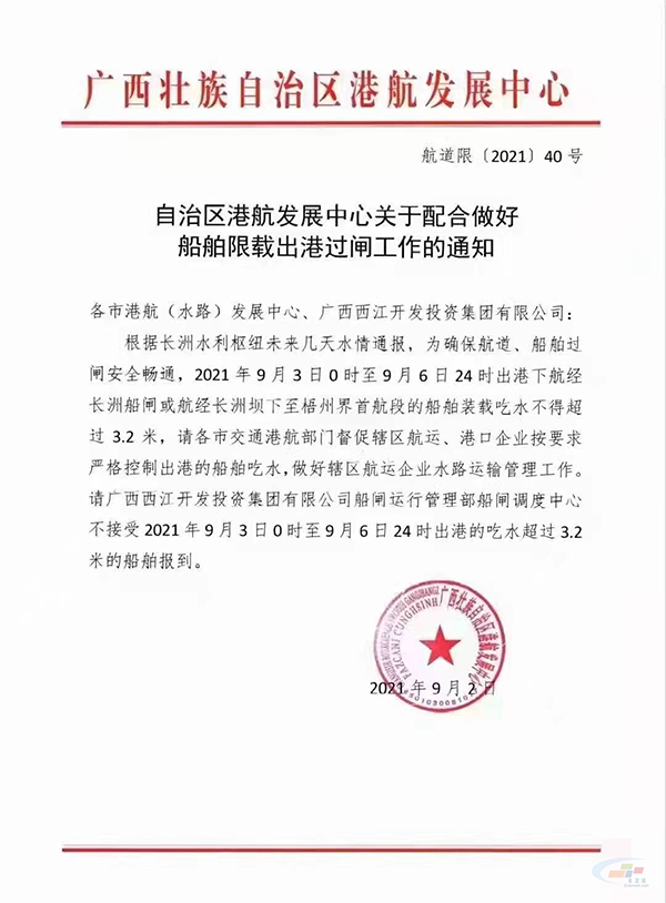 2021年9月3日0時(shí)至9月6日24時(shí)出港下航經(jīng)長洲船閘或航經(jīng)長洲壩下至梧州界首航段的船舶裝載吃水不得超過3.2米。......