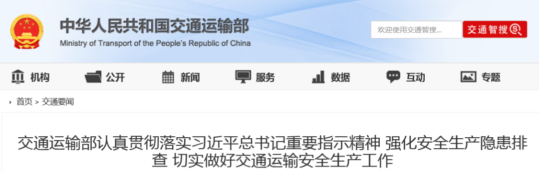 一,交通運(yùn)輸部認(rèn)真貫徹落實(shí)習(xí)近平總書(shū)記重要指示精神 強(qiáng)化安全生產(chǎn)隱患排查 切實(shí)做好交通運(yùn)輸安全生產(chǎn)工作日前,為認(rèn)真貫徹習(xí)近平總書(shū)記關(guān)于“3·21”東航MU5735航空器飛行事故重要指示精神和李克強(qiáng)總理等中央領(lǐng)導(dǎo)同志批示要求,舉一反三,壓實(shí)責(zé)任,交通運(yùn)輸部就做好交通運(yùn)輸安全生產(chǎn)工作進(jìn)行了緊急部署。